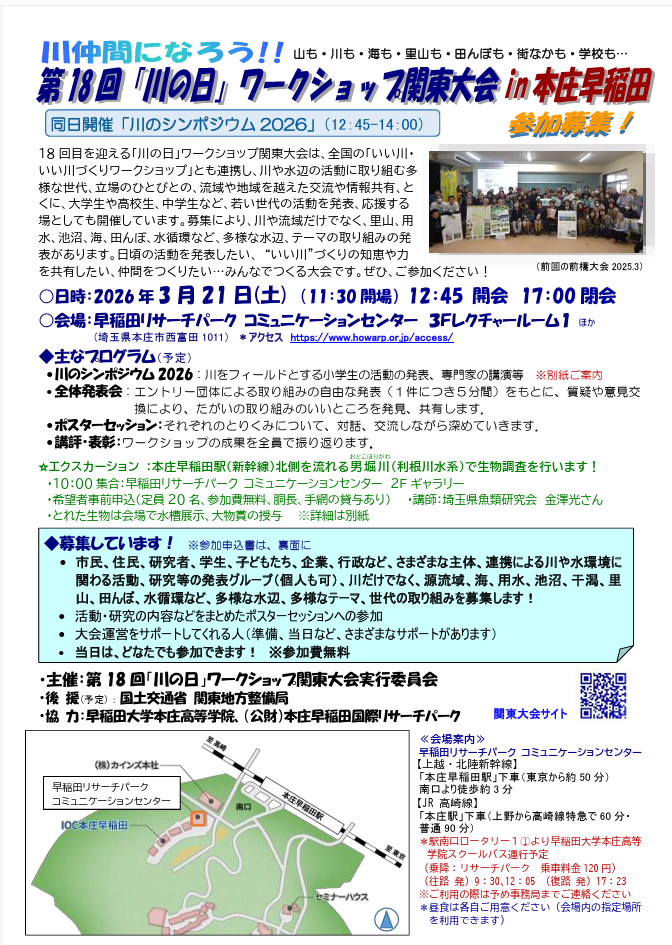 「川仲間になろう! 川の日ワークショップ関東大会in本庄早稲田」開催のお知らせ